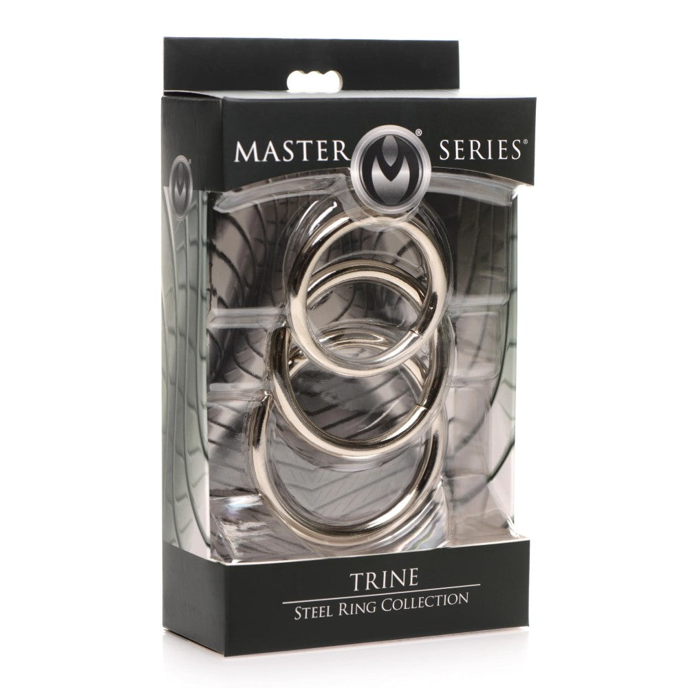 Simple in form, yet intended to be worn with purpose. These steel cock rings are as elegant as they are strict. There is no give here! Simply slip a Trine over the penis like a halo, encircling the scrotum for a supremely snug fit. Revel in the pleasure! The Trine Steel Rings can also be used to fit most harness systems.