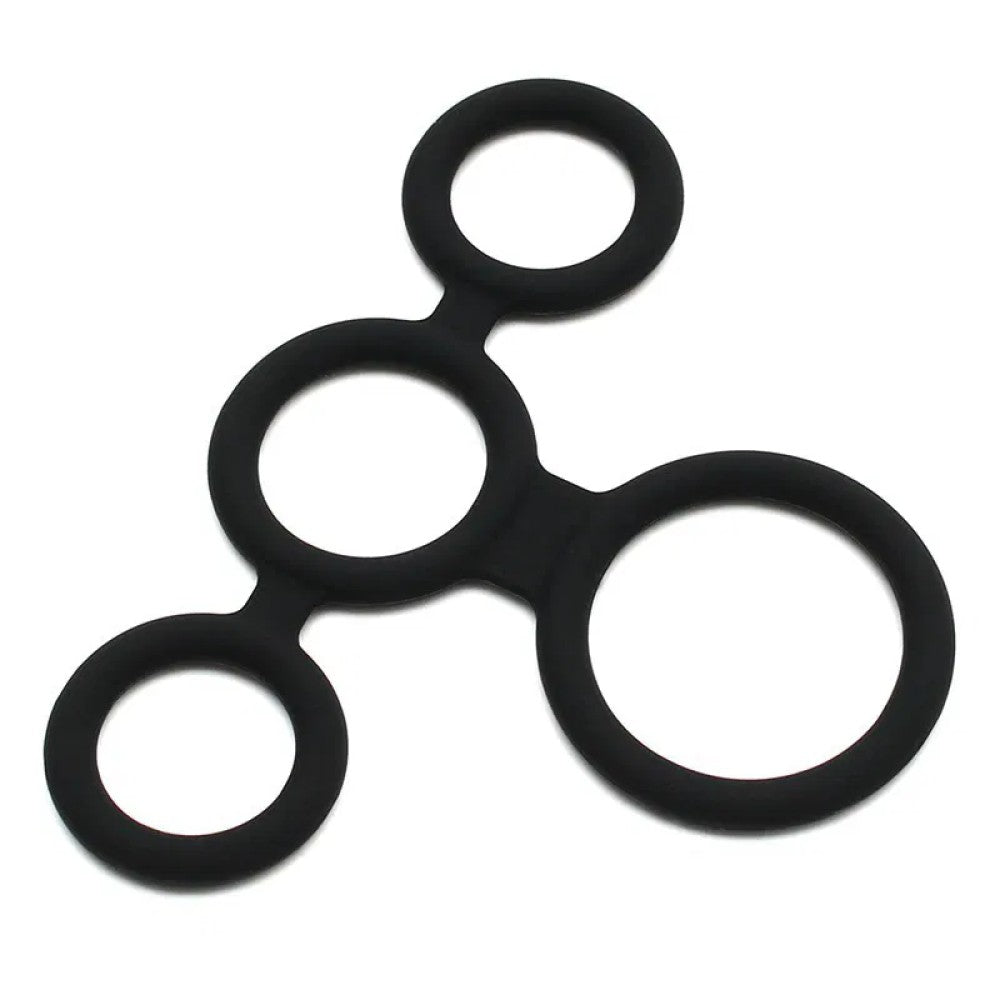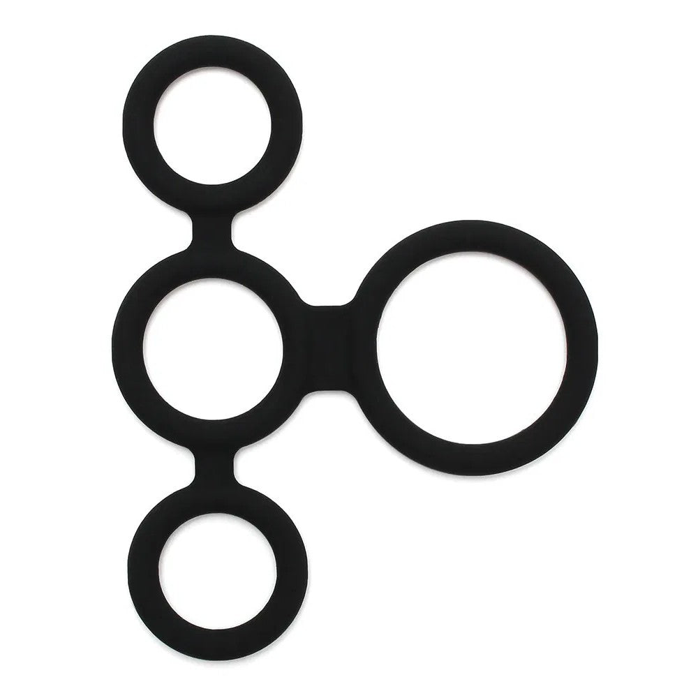 This cock ring has four rings that are attached to each other: one with a diameter of 4 cm, one with a diameter of 2.5 cm and two with a diameter of 2 cm. The largest ring (4 cm) needs to be worn around the scrotum. The second ring (2.5 cm) should be worn around the shaft. The two smaller rings (both 2 cm) should be placed around one testicle each, splitting the balls.