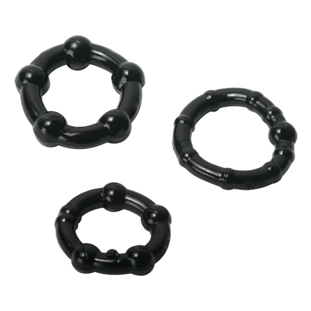 Each ring has a unique set of bumps for added stimulation while wearing. Each set includes three penis rings, each a different size and pattern.