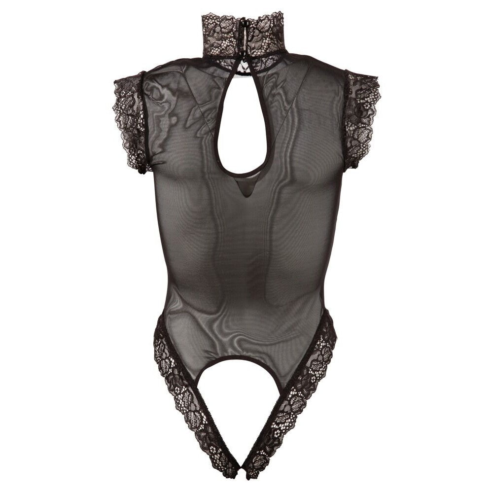 Black transparent body with lace trimmings on the sleeves, collar (2 buttons at the back) and around the legs. Breasts and crotch are open and decorated with detachable chains.