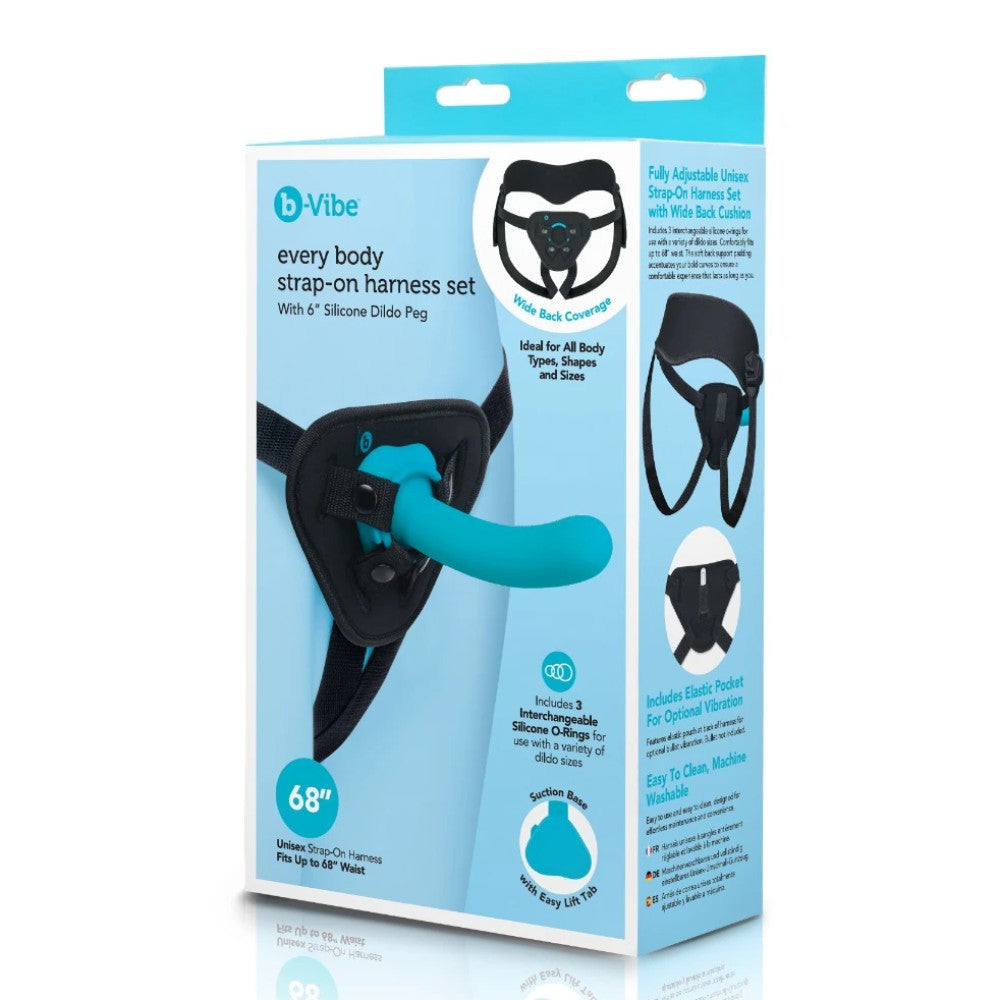 Experience pleasure like never before with the new b-Vibe Every Body Strap-On Harness Set. Designed with a unique shape that contours to your body, this comfortable harness provides excellent support and stability. The included 6-inch silicone dildo is made from smooth, body-safe silicone, gliding effortlessly during use. Its tapered tip ensures easy insertion, while the suction base allows for versatile play, with or without the harness. Perfect for enhancing intimate experiences, this peg delivers a fulfilling sensation that elevates your pleasure to new heights.