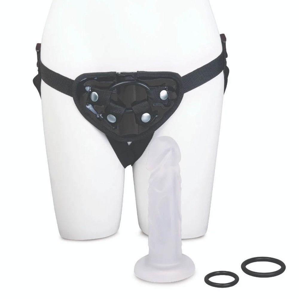 Introducing the Me You Us Frosted Harness Kit with a 6 inch Frosted Jelly Dildo, designed for both beginners and experienced users.