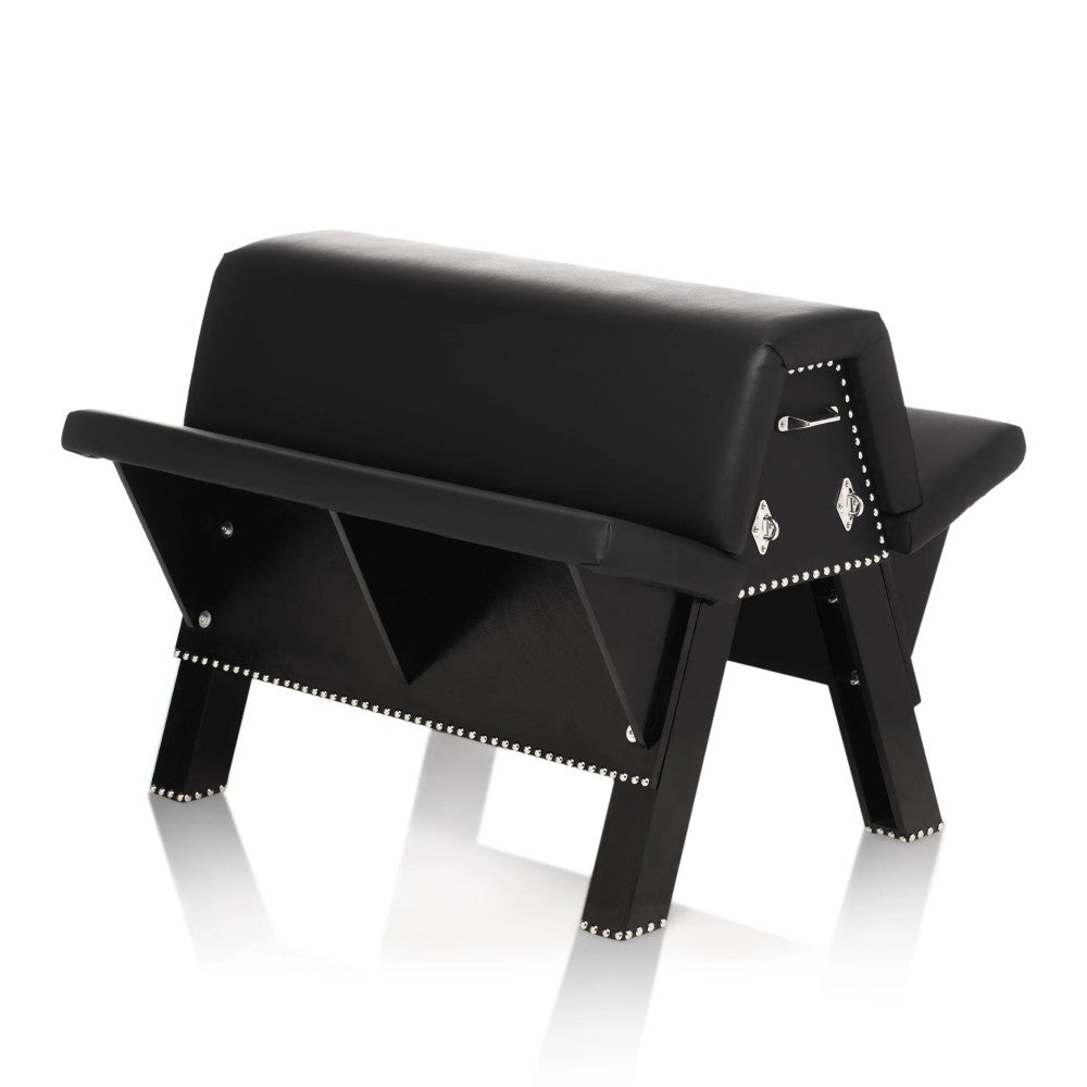 Transform your space by adding a classic bondage bench as the centrepiece of your pleasure. The classic design and smooth, black, vegan friendly leather with bold metal accents stand out and invite you to give in to your darker desires. The smooth faux leather feels divine against bare skin as you indulge in devious play with your partner! Restrain them to the bench with cuffs that attach to any of the 6 attachment points. Tease and torment your submissive to your heart's delight by introducing different impact toys and play! This sturdy, wood and metal bench can handle up to 660 lbs so you both can hop on and enjoy each other. The padded cushions make it comfortable for you both to kneel, straddle or sit for sexy scenes!