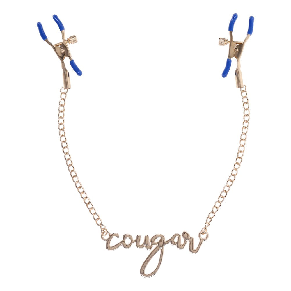 These elegant clamps feature a luxurious gold chain with the word "Cougar" written in cursive between them, embodying both style and playfulness. Featuring adjustable tension, these clamps are perfect for exploring new sensations. The sultry blue hue adds a fierce edge, ensuring every moment is as stylish as it is stimulating.