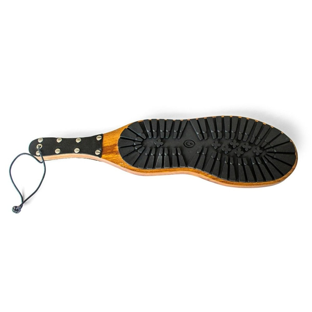 The paddle's striking surface mimics a rugged boot sole—delivering textures that tease, sting, or thud depending on how you wield it.