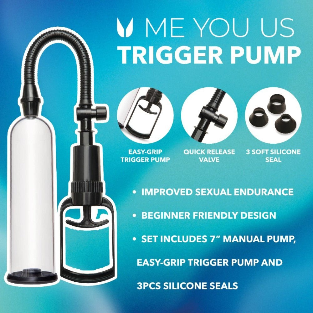 Pump up your performance with the Me You Us Trigger Pump Suction Pump. Designed for ease of use, this effective tool enhances size and stamina with regular use. Simply slide your penis into the clear pumping chamber and watch it grow bigger and stronger. The silicone entrance ensures a comfortable, air-tight seal, while the marked cylinder lets you track your progress.