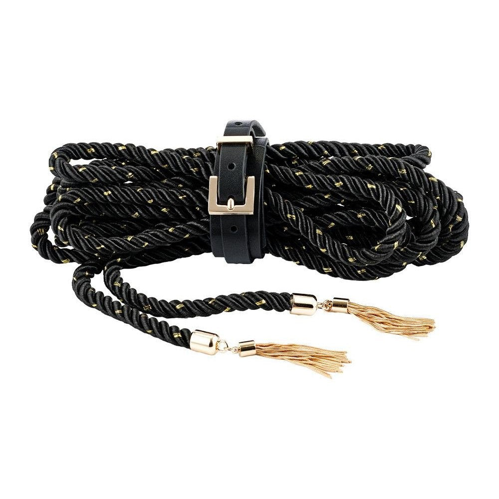 Designed for those who appreciate both form and function, the Embrace Rope 7M glides easily against the skin while maintaining enough structure for secure knots and reliable tension. Whether wrapped gently around wrists or shaped into a striking torso harness, each bind enhances connection and anticipation. The shimmering gold accents and elegant tassel ends elevate the rope from a simple restraint to an experience in itself—adding glamour to every twist and tie.