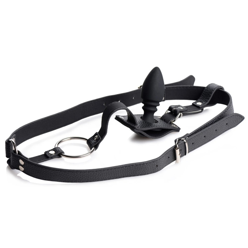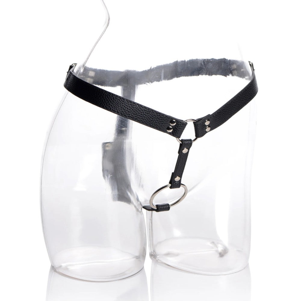 This harness combines a hard, unrelenting metal cock ring with a rippled silicone butt plug.