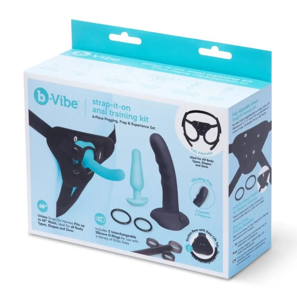 Dive into your pegging adventures with the b-Vibe Strap-It-On Anal Training Kit, featuring a 4” Beginner’s Starter Plug for gentle exploration, a 5" Silicone Dildo perfect for beginners, and a thrilling 7" Vibrating Ridged Silicone Dildo. Both dildos easily attach to the strap-on harness, which fits waists up to 68“, making it accessible for everyone. Ideal for those new to pegging, this versatile kit promises a variety of options to enhance pleasure and intimacy, allowing you to explore new heights of satisfaction together. The kit also includes a lubricant applicator, ensuring a smooth and enjoyable experience as you discover and enjoy your fantasies in a fun, safe, and exciting way.