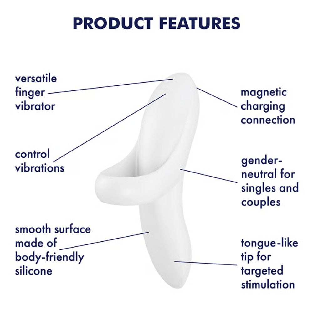 Wrap the Satisfyer Bold Lover around your finger: Just slip your finger through the loop and stimulate your erogenous zones with powerful and deep vibrations. Whether you use it as a clitoral vibrator or for other hot spots such as the penis, nipples or perineum – the Satisfyer Bold Lover shines with its diverse application options and intuitive operation. Thanks to its small tip, it provides precise and targeted stimulation. The 12 vibration programs of the finger vibrator also offer variety when playing solo or as a couple.
