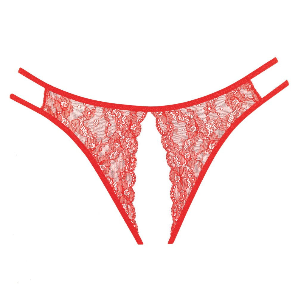 Seductively sweet, scalloped lace sweeps tantalizingly across the front leaving a peekaboo opening. Double skinny straps graze the hips with a very cheeky cut of sheer mesh in the back.