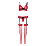 This three-piece bra and panty set is perfect for the most romantic night with your soulmate. It has adjustable straps, net and bow accents and matching fishnet stockings. This set makes Valentine's Day complete.
