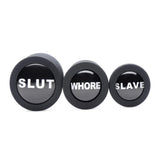 Each plug features a naughty name for your ass - or your playthings ass to display: Slave, Whore, and Slut! Which one will that hole be branded with?