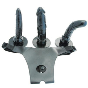 Three black dildos: natural shape (16 cm, Ø 3.5 cm), slim design particularly suitable for anal pleasure (15 cm, Ø 1.5-2.5 cm) and bent dildo for stimulation of the G-point (15 cm, Ø 3.5 cm) plus open hole size adjustable harness for the perfect wearing comfort.